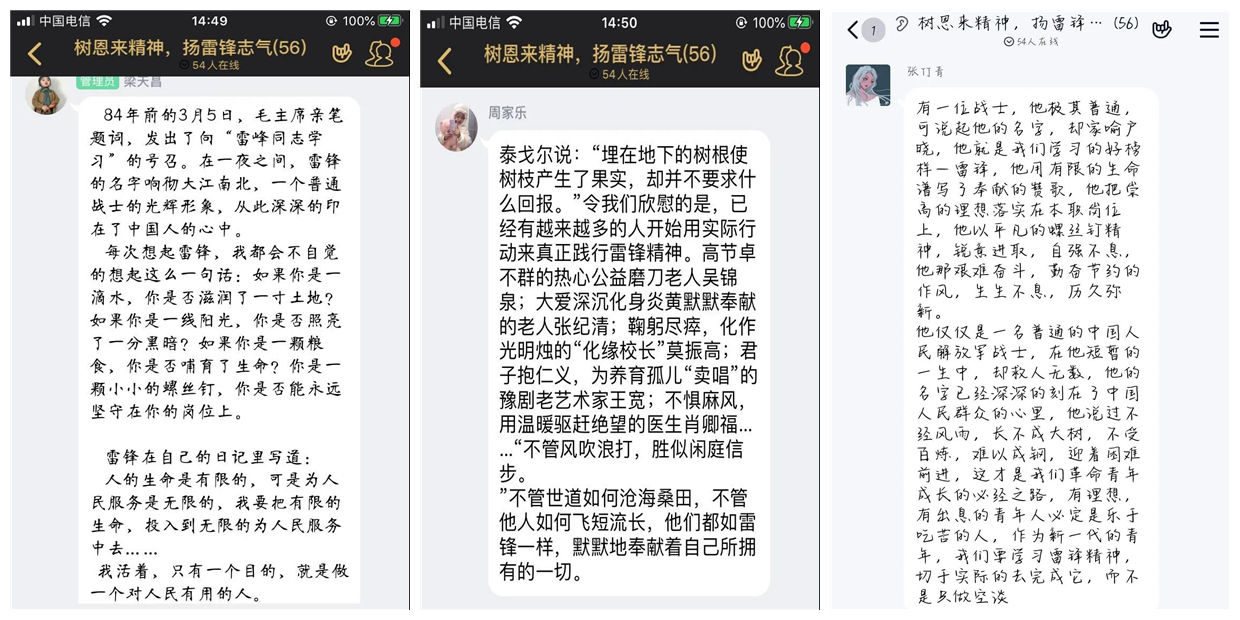 我班同学观看影片后积极线上交流分享心得,学习雷锋精神,发扬传媒人情怀,雷锋精神也犹如一座永不熄灭的灯塔,引领着我们一代又一代人奋勇前行。