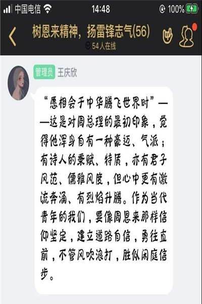 在周恩来诞辰122周年到来之际,最好的怀念,应是不忘他毕生的心愿,延续他千古垂范的精神品格。46年前的3月5日,毛主席亲笔题词,发出了向“雷锋同志学习”的号召。疫情期间,在这春意盎然的日子里,我班举办了“树恩来精神,扬雷锋志气”的线上主题交流会。由我班全体同学和班主任共同参与。