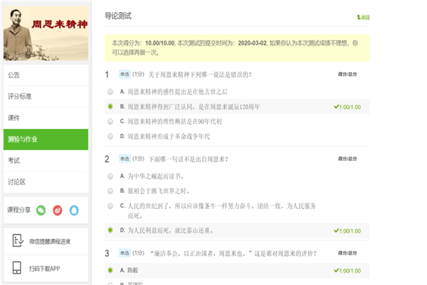 图为同学们学习周恩来精神的测试题。记者 钱佳佳 摄