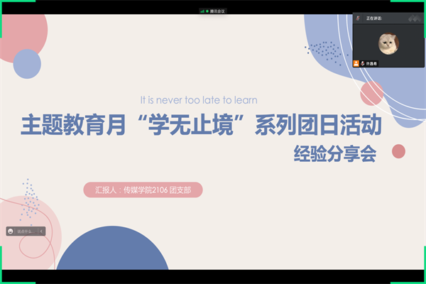 4月1日,传媒公司2106团支部线上开展“学无止境”系列活动之读书分享会。本次活动邀请了班级“学霸”代表刘洁、费思怡、陈茁等同学推荐高质量的专业书籍并分享自己的学习秘籍。