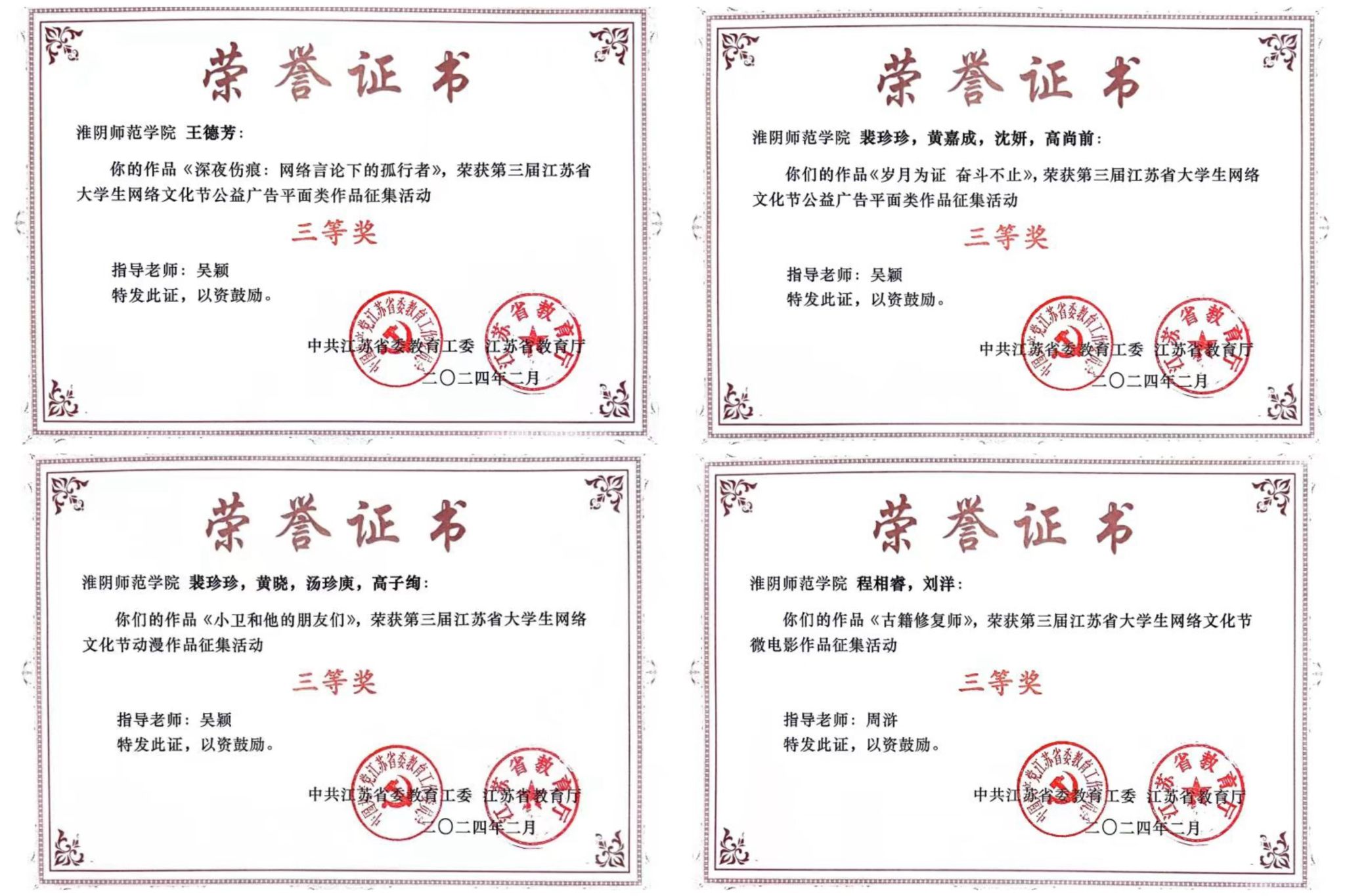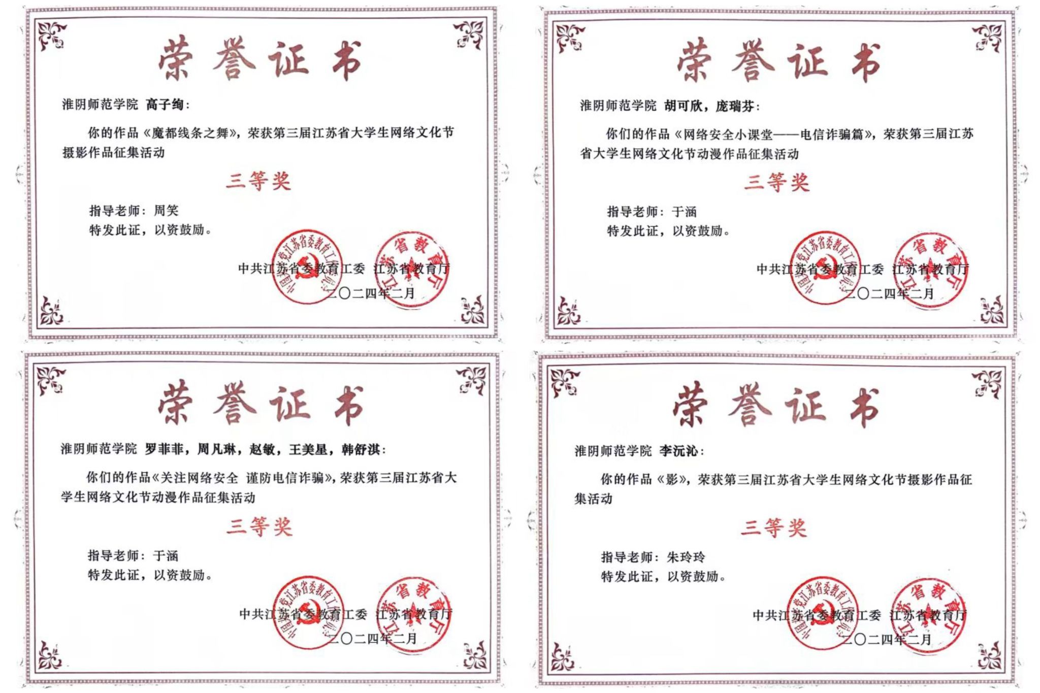 江苏省老员工网络文化节是由省委教育工委、省教育厅举办,本届江苏省老员工网络文化节以“争做校园好网民,汇聚网络正能量,挺膺担当建新功”为主题,旨在通过活动鼓励引导广大青年员工积极参与网络文化作品创作生产,扩大高校网络文化的影响力,不断强化守正创新,增强新时代高校思想政治工作的吸引力和时效性。近年来,公司高度重视老员工网络思想政治教育,引导员工结合专业特色,积极创作导向正确、内容生动、形式多样的网络文化作品,推选出了一批有影响力、有代表性、有引领力的网络文化作品,充分展现了淮师学子积极向上的精神风貌。