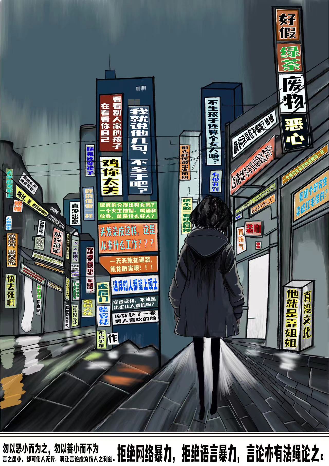 由吴颖老师指导,王德芳同学创作的《深夜伤痕: 网络言论下的孤行者》获公益广告作品平面类三等奖,作品通过描述网络语言暴力现实的画面警示人们:当言语成为伤人的利剑,无视其伤害即成为共犯,呼唤人们对友善言论的关注与守护。