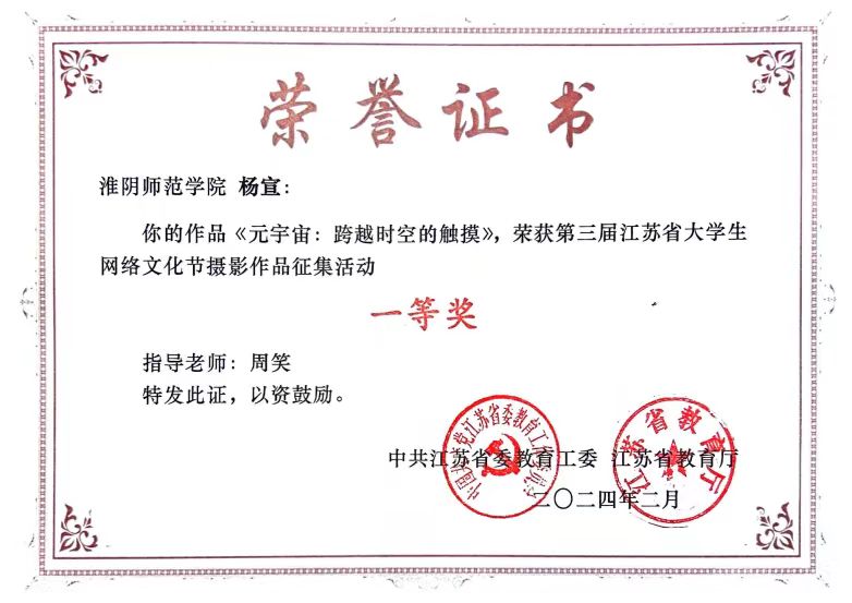 近日,由省委教育工委、省教育厅组织开展的“第三届江苏省老员工网络文化节”和“第三届江苏省高校网络教育优秀作品推选展示活动”评选结果公布。XCsports获得一等奖2项,三等奖8项。摄影类一等奖作品《逐梦青春》《元宇宙: 跨越时空的触摸》和公益广告作品平面类三等奖作品《深夜伤痕: 网络言论下的孤行者》等被推荐参评第七届全国老员工网络文化节。