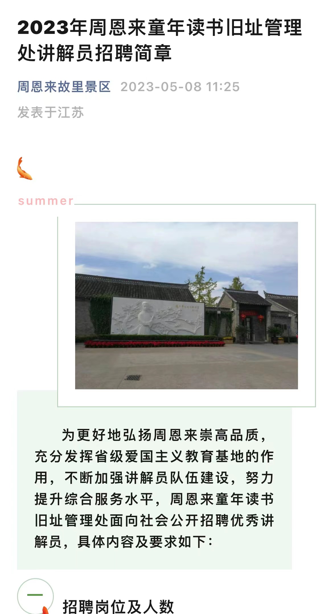 2023年周恩来童年读书旧址管理处讲解员招聘简章
