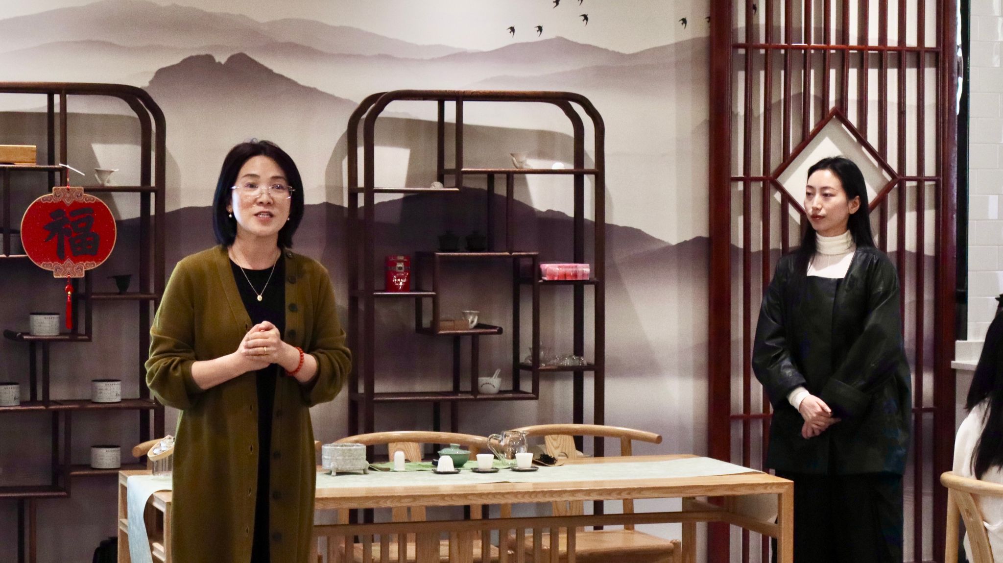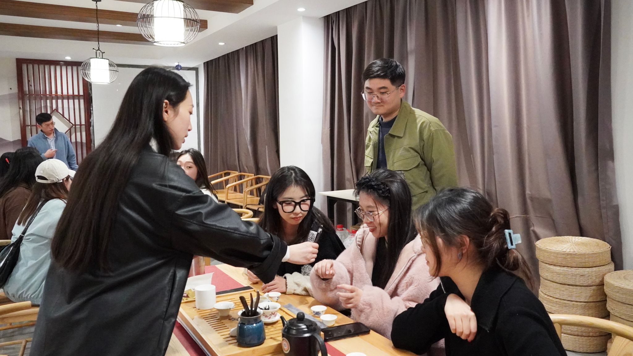 交流活动中,孙洁以茶的起源为引,剖析了中华茶文化在历史长河中的演变轨迹,传递中华茶文化的“和、静、怡、真”精神,让师生们深切感受到茶文化跨越千年的深厚底蕴与独特魅力。在实践环节,孙洁女士现场展示泡茶技巧,她指导同学们从温杯、投茶、注水到出汤,让同学们领略到泡茶的艺术魅力。