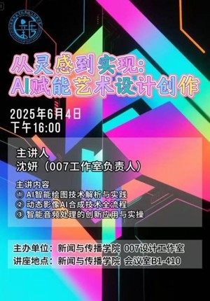 活动中,沈妍系统展示了AI技术在艺术设计创作流程中的应用,涵盖AI绘图技术解析与实操、动态影像AI合成全流程及智能音频处理的创新应用三个方面。她结合即梦APP 的“三步速成法”等生动实例,教会大家如何高效利用AI工具,在短时间内完成赛级作品。沈妍还分享了其个人在AI领域的学习与实践经验,通过大广赛、蓝桥杯、数媒赛等权威赛事的获奖案例,深入剖析了AI技术如何助力创意实现。