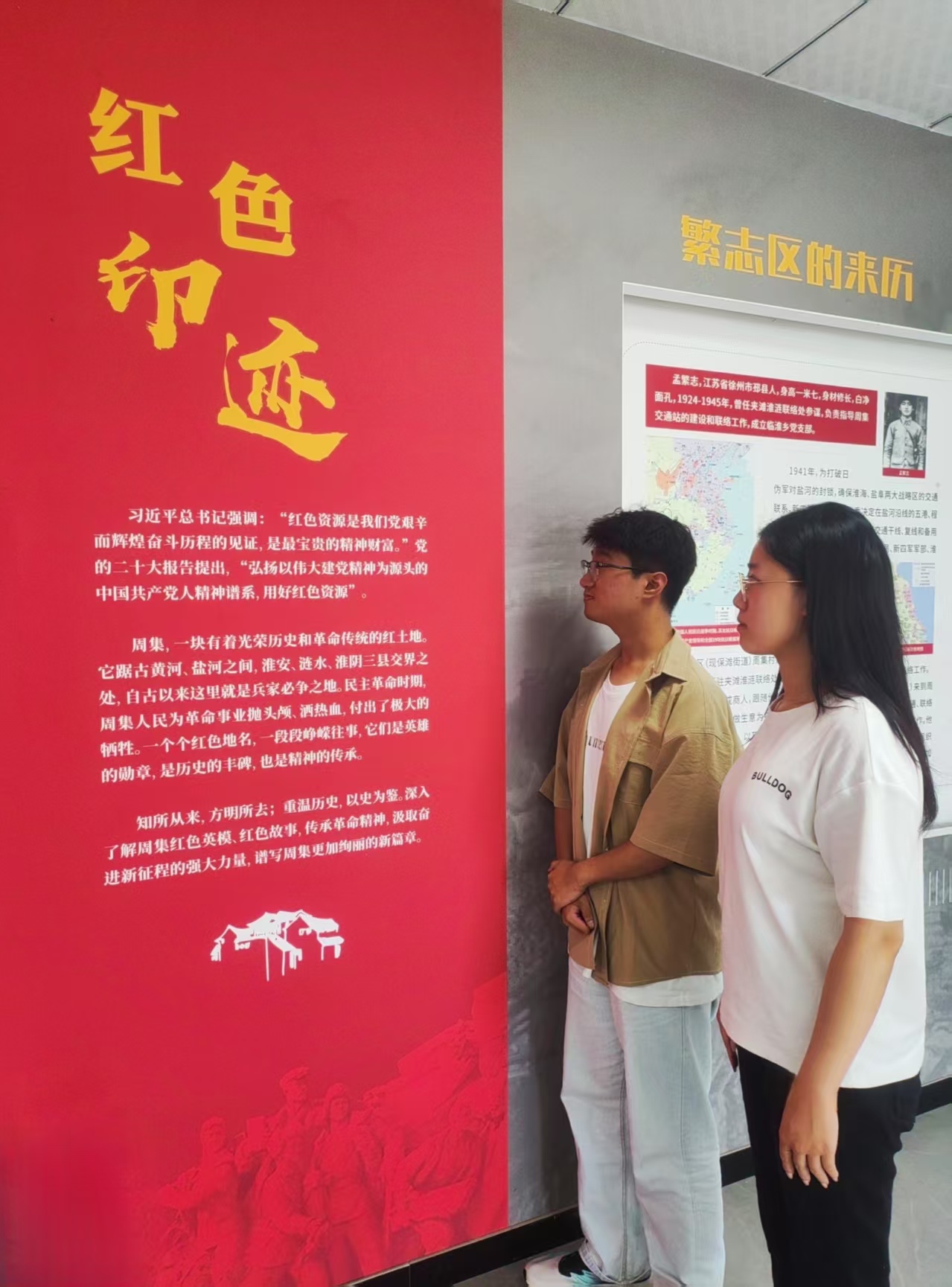 党支部成员来到周集“红色印迹”文化墙深入了解周集村的红色历史、红色英模、红色故事,一个个红色地名、一段段峥嵘往事让同学们深刻感受到周集人民为革命事业无私奉献的大爱精神,帮助同学们进一步坚定理想信念,传承革命精神。