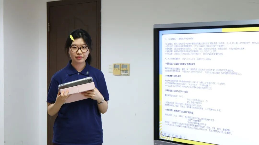 徐润思组以“从操纵到自我操纵”为题,结合“虞书欣粉丝网暴事件”与“Jellycat营销策略”,揭示了现代宣传如何通过信息过滤、情绪激发与框架设置引导公众行为。他们提出问题“在数字时代,大众究竟是宣传的被动受害者,还是操纵的主动推动者?”。沈薏如组聚焦“正义感被操纵”的现象,以“胖猫事件”和“青岛地铁打人事件”为例,剖析营销号如何利用情感唤醒、替罪羊机制与从众效应策动网络暴力。他们呼吁建立“批判性暂停”机制,提升个体媒介素养。蔺佳欣组从认知偏差与心理机制出发,指出人类作为“认知吝啬鬼”更容易接受情绪化、简单化的结论。他们以瑞幸咖啡的文案策略为例,说明即使是商业宣传也深谙情绪操控之道。郑颖奇组则从新闻工作者的责任出发,强调媒体应成为认知生态的“建设者而非破坏者”。他们提出,抵御操纵需多元信源、批判思维与平台责任的共同作用。