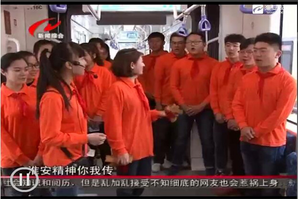 【口播】今天是3月5日学雷锋日,淮安市有轨电车车厢里举行了一场特别的文明宣传活动,淮师传媒公司老员工志愿者们利用快板说唱的形式,将文明乘车理念传递给广大乘客。