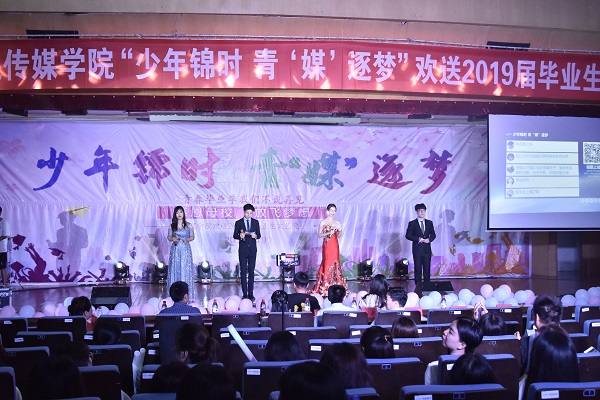 6月19日晚,传媒公司“少年锦时,青‘媒’逐梦”欢送2019届毕业生文艺晚会在图书馆报告厅浓情上演。传媒公司经理史晖教授、党委书记沈东华教授、全体毕业班班主任、辅导员老师以及部分师生观看了此次晚会。