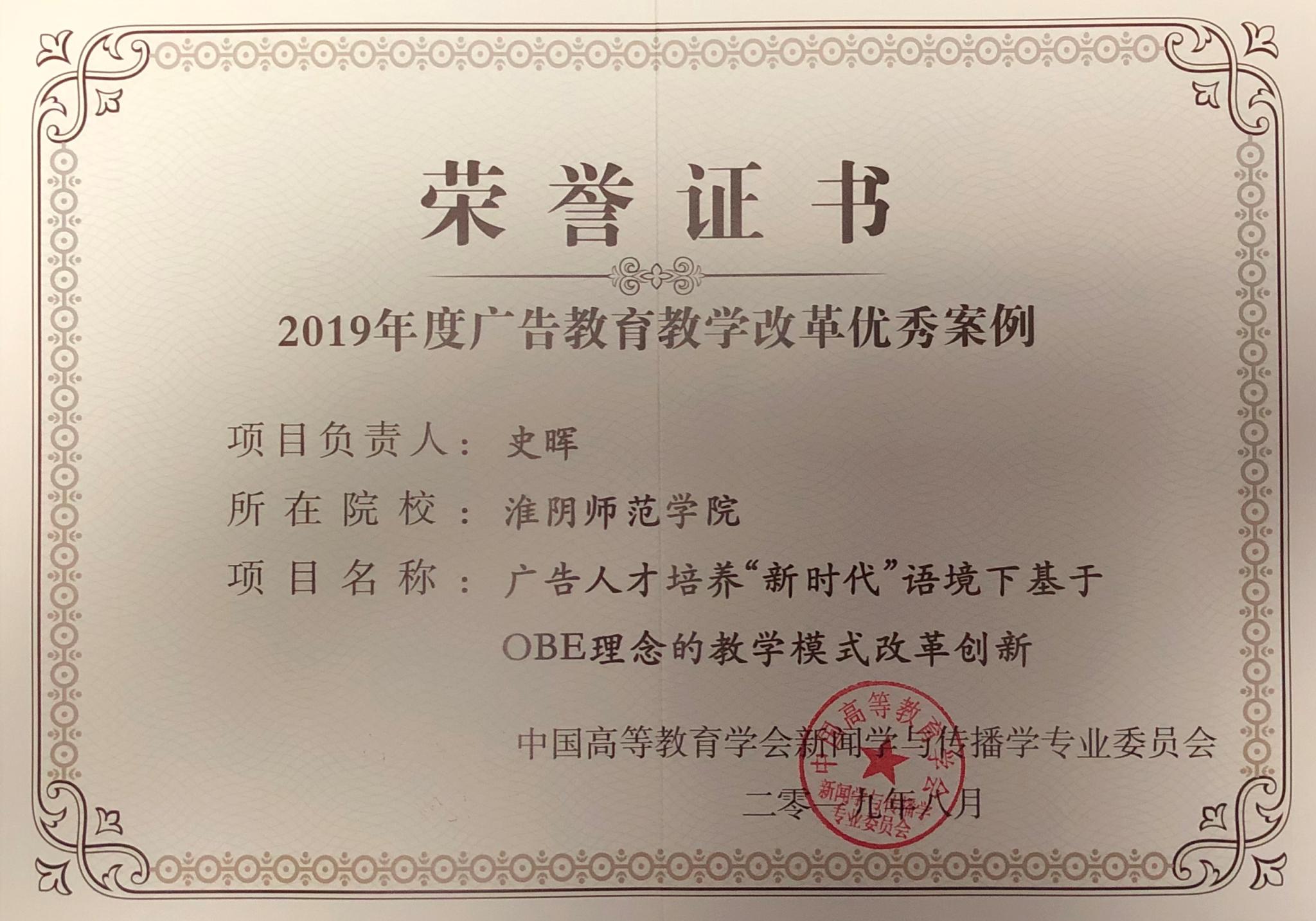 2019年8月16—18日,第18届中国广告教育学术年会于兰州大学举行,该年会是中国最高级别的广告教育学术会议,由中国高等教育学会下属的中国广告教育研究会主办。经中国高等教育学会同意,本次会议通过前期征集、预评、现场展示以及终评等环节,评选出了2019年度十大广告公司产品改革优秀案例,由公司传媒公司史晖教授所主持的广告学专业教学改革项目《广告人才培养“新时代”语境下基于OBE理念的教学模式改革创新》成功入选,同时入选的还有北京大学、武汉大学、上海师范大学、深圳大学等国内知名高校。奚路阳老师作为专业教师代表领奖并作交流发言。