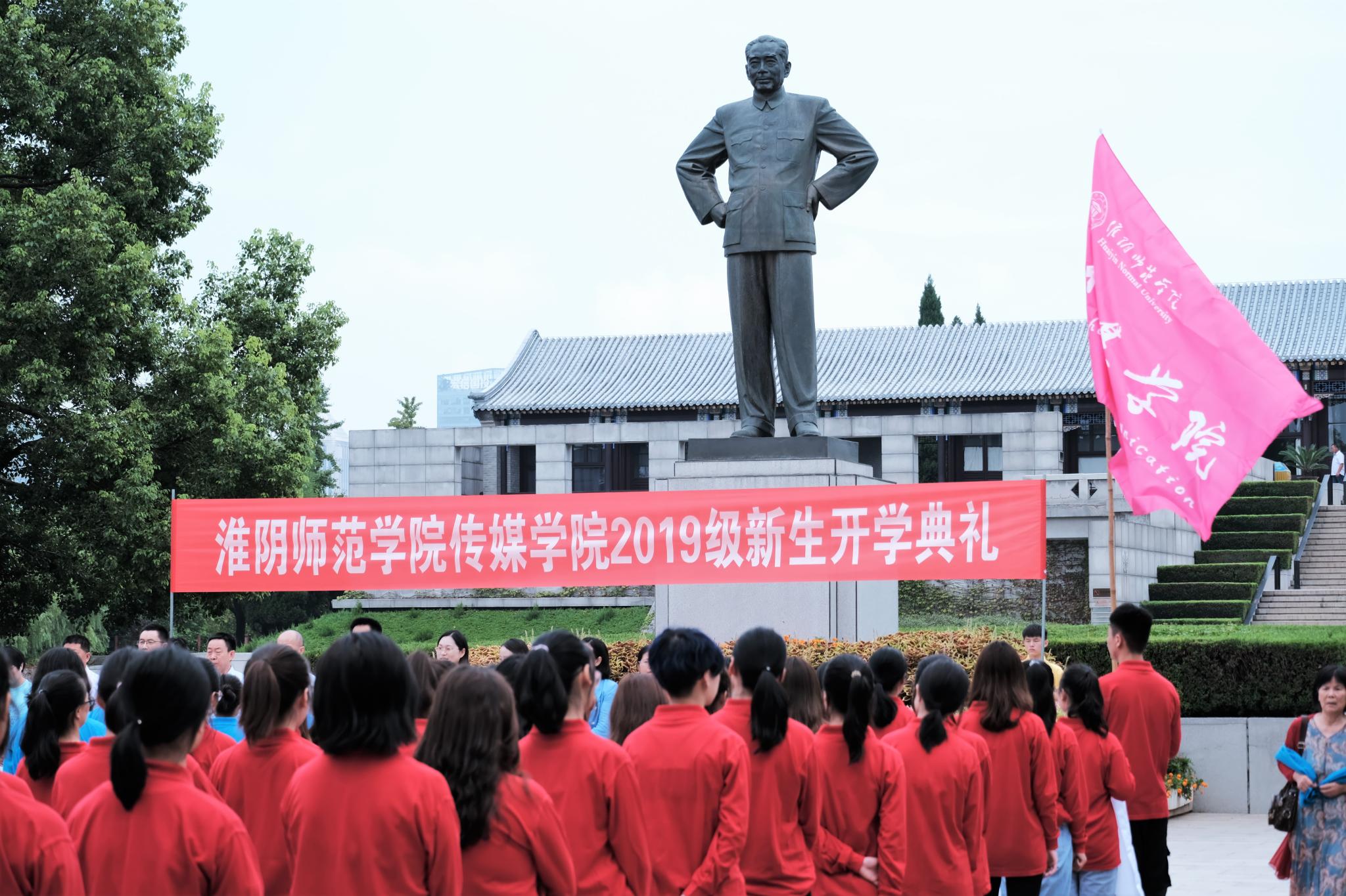 同学们来到周总理家乡求学,是种缘分;我们选择在周恩来纪念馆隆重举行开学典礼,别有用意。在新生报到现场,大家看到图书馆翔宇广场有一条醒目标语:坚持用周恩来精神立德树人。一进公司大门,首先映入眼帘的就是周恩来“为中华之崛起而读书”的名言石碑。周总理一生为了新中国的建立与建设鞠躬尽瘁死而后已,令世人敬仰。去年3月,在纪念周恩来同志诞辰120周年座谈会上,习近平总书记深情地说:“周恩来,这是一个光荣的名字、不朽的名字。每当我们提起这个名字就感到很温暖、很自豪。周恩来同志在为中国人民谋幸福、为中华民族谋复兴、为人类进步事业而奋斗的光辉一生中建立的卓著功勋、展现的崇高风范,深深铭刻在中国各族人民心中,也深深铭刻在全世界追求和平与正义的人们心中。”作为新时代的青年,你们赶上了千载难逢的历史机遇,从建党一百年到建国一百年,你们正处在20岁到50岁的黄金年龄段,处在中华民族发展的最好时期,既面临着难得的建功立业的人生际遇,也面临着“天将降大任于斯人”的时代使命,建设富强民主文明和谐美丽的社会主义现代化强国的重任义不容辞地落在你们肩上。大家现在进入了大学,需要思考三个问题:我来淮师传媒为什么?四年后离开淮师我能做什么?将来我要成为什么样的人?周总理立下了“为中华之崛起而读书”的宏愿,我们也要树立为中华民族伟大复兴而努力学习的远大志向,把个人之梦融入“两个一百年”新征程和实现中国梦的滚滚大潮之中,以青春之我、奋斗之我,勇做走在时代前列的奋进者、开拓者。