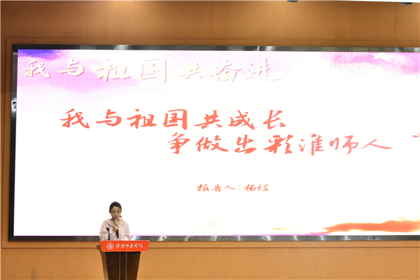 最后,优秀员工代表杨煜演讲的《我与祖国共成长,争做出彩淮师人》,她给在场的同学们提出建议:“希望同学们能够积极拥抱老员工活,规划好学业,树立远大的目标,脚踏实地走好每一步。”