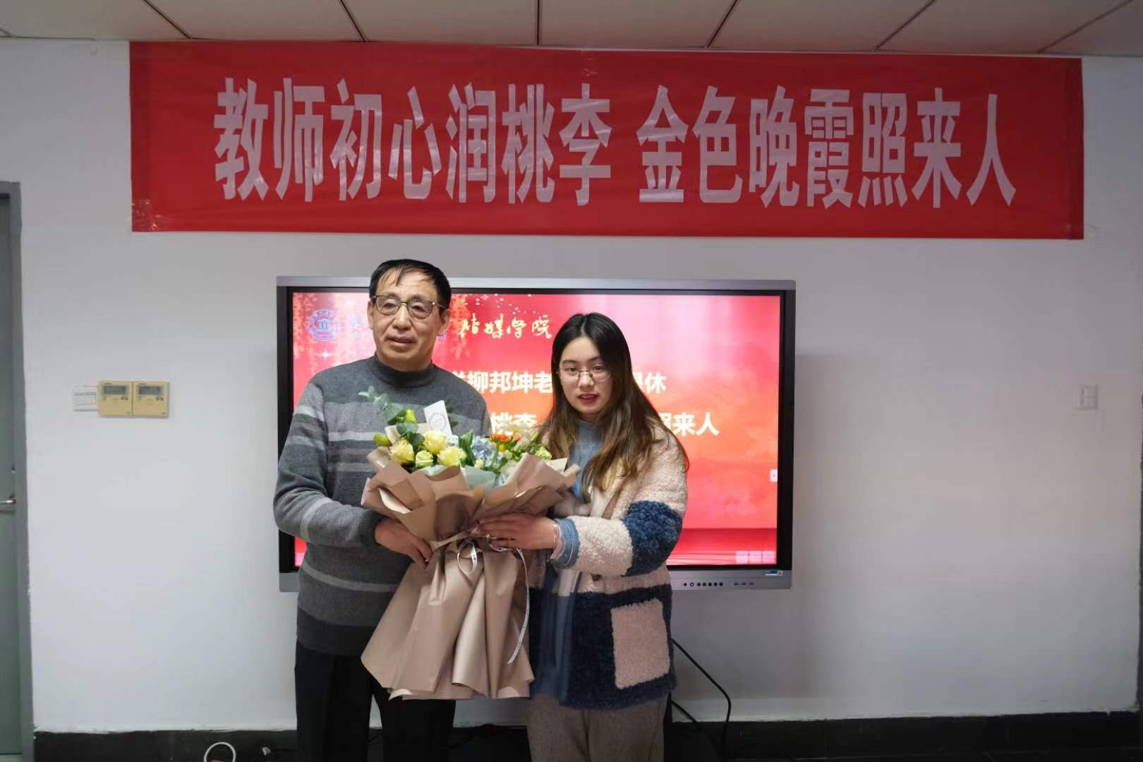 校工会主席金钊代表校工会祝贺柳邦坤教授光荣退休,他认为,教师首先应该做师德高尚的“圣人”,要以德立身、以德立学、以德施教;其次,要做关心员工的“贵人”,全方位地围绕员工、关照员工、服务员工;还要做情趣高雅的“达人”,让生活多一些色彩,多一些闲情雅趣。柳邦坤教授12年来始终如一地坚守着自己热爱的教育事业和可爱员工们,他用行动真正实现了自我的价值和生活的幸福。