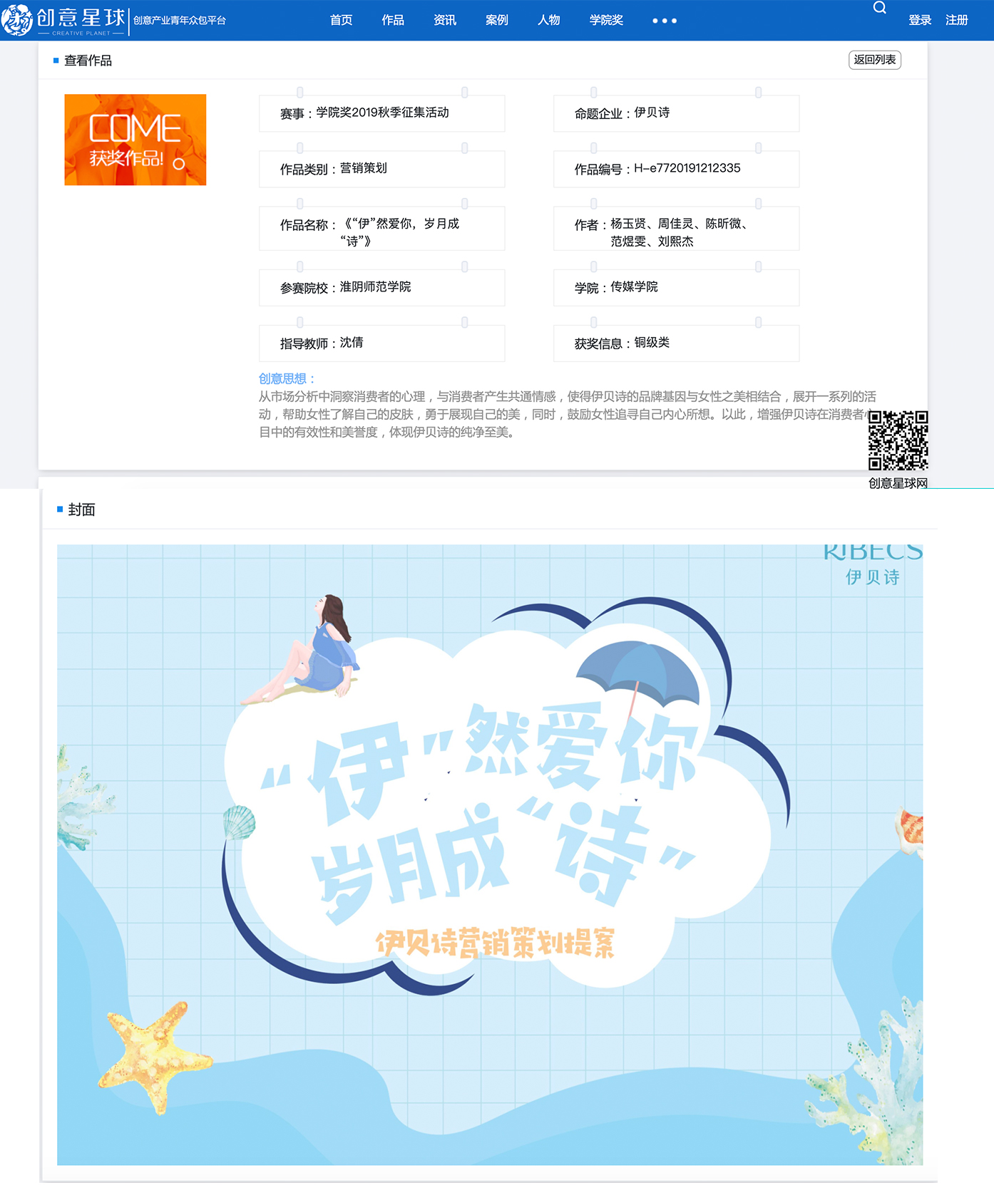沈倩老师指导、17级广告学专业杨玉贤、周佳灵、陈昕微、范煜雯、刘熙杰五位同学共同创作的“伊贝诗”化妆品营销策划作品《“伊”然爱你,岁月成“诗”》获得本策划类铜奖。