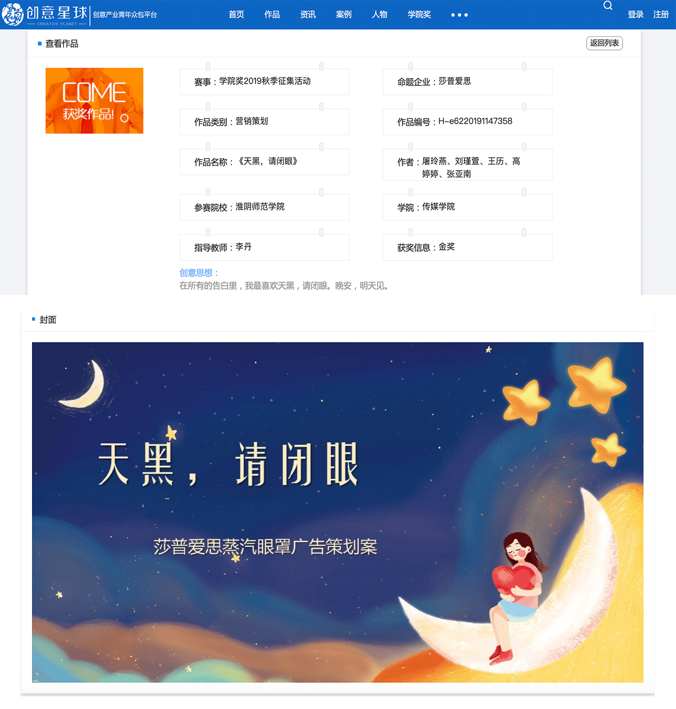 李丹老师指导、16级广告学专业屠玲燕、刘瑾萱、王历、高婷婷、张亚南五位同学所创作的“莎普爱思药业”营销策划作品《天黑,请闭眼》,获得策划类金奖。这是传媒公司在以往多次获得“公司奖”赛事银奖、铜奖之后,在金奖项目上零的突破。