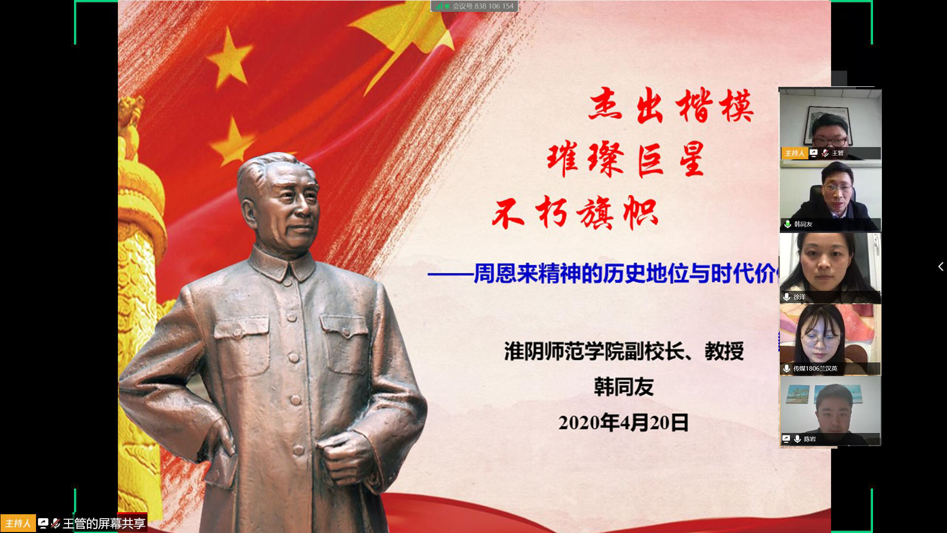 4月20日下午,传媒公司“传习讲堂”第二讲邀请XC体育副董事长韩同友教授作“周恩来精神的历史地位与时代价值”专题报告,本次活动通过腾讯会议线上直播的形式开展,传媒公司部分“周恩来班”创建班级参与本次线上讲座。传媒公司党委书记王管主持讲座。
