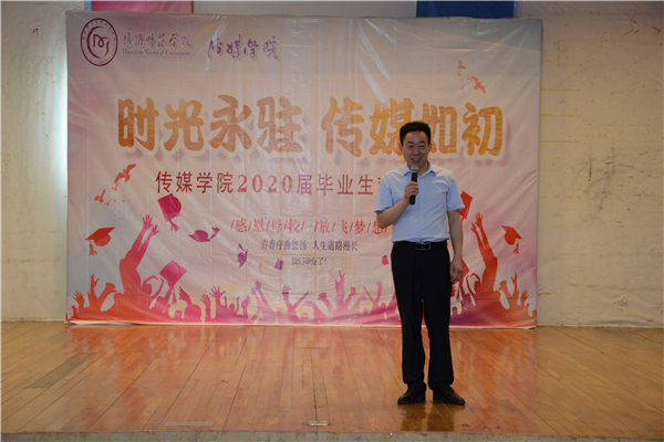 传媒公司经理史晖向全体毕业生致词,史晖说,我想送你们三颗“心”,第一是要有信心,无论走到哪里,都要有作为淮师人给的底气和自信;第二是要有进取心,我们坚持活到老学到老,要永葆一颗进取之心;第三是要有爱心,与人为善,葆有爱心,是做人最基本的“心”。他寄语毕业生们,愿你们历经千帆,仍是少年,星辰大海,一路阳光。