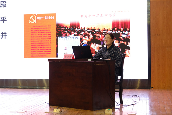 管爱花紧紧围绕《习近平谈治国理政》第三卷主体内容,从深刻领会第三卷文稿形成的时代背景与实践基础和全面把握第三卷文稿的逻辑体系与创新特色两个方面作学习报告辅导。她从三大重要历史决议引出胸怀两个大局这个主题,她强调,我们始终以“坚持和发展中国特色社会主义”为主线,把握“五位一体”和“四项工作”的逻辑结构。