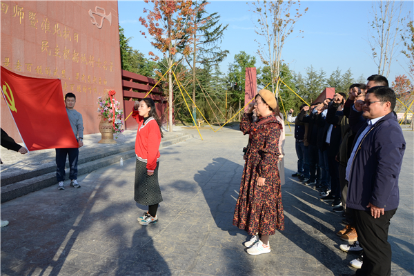 新四军四师师部曾驻扎在泗洪县陈圩乡大王庄,公司党员在大王庄内参观了刘少奇、陈毅、彭雪枫等老一辈无产阶级革命家在此战斗过生活过的场景,探寻革命先烈足迹的同时,学习了革命先烈的艰苦奋斗精神,深刻感受了泗洪浓厚的红色文化革命气息,领悟了党的事业与人民群众的鱼水之情、血肉联系。在讲解员的带领下,全体党员同志来到了新四军四师暨淮北抗日民主根据地将士名录墙前,全体党员列队肃立面对党旗重温入党誓词。