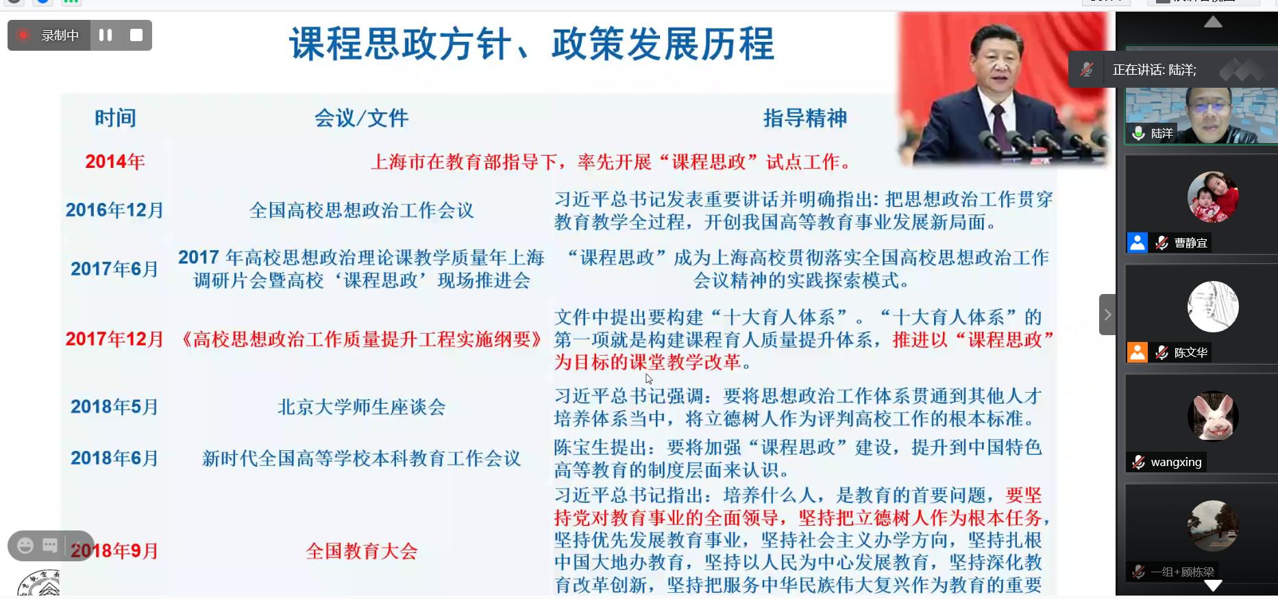本次培训分为“课程思政是什么?”“课程思政教什么?”“课程思政怎么教?”三个方面,陆教授从“白鹿洞书院教条”、上海大学课程思政通识课程探索等阐释了课程思政的起源、发展脉络。他通过解读课程思政的内涵、高等公司课程思政建设指导纲要、教学的三个目标维度等,深入分析了课程思政内容的选择、融入路径和标准。并通过大量鲜活的课程思政教学案例分析,展示了多元化教学方法、组织和引导员工积极参与和体验、拓展教学时间与空间、人力资源应用、社会资源的发掘和应用、网络应用等课程思政融入教学实践的具体实施办法。