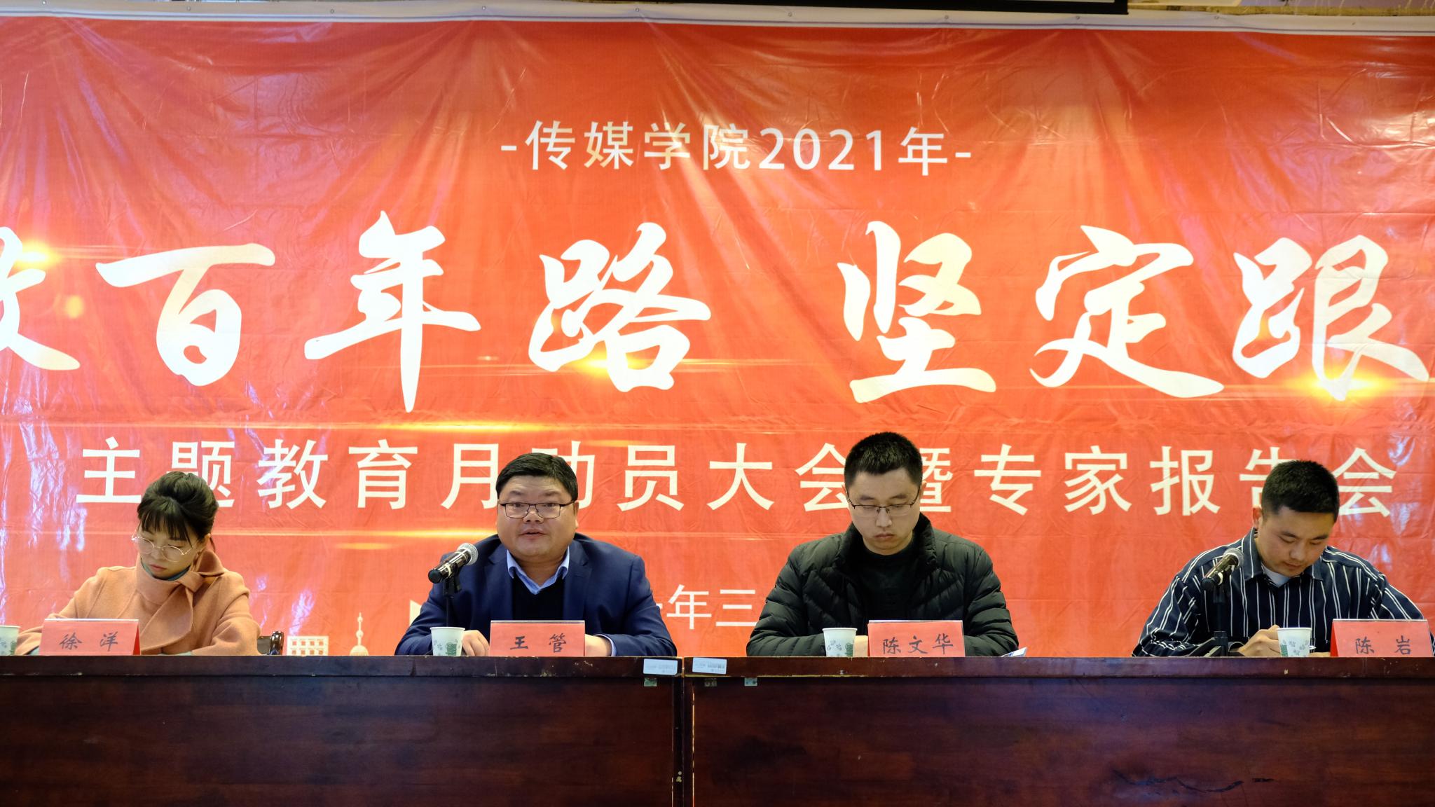 活动分为两个阶段,第一阶段为专题动员。王管就本次主题教育月活动作动员讲话。他从把握背景,提高思想认识;明确节奏,有序开展推进;明晰重点,确保取得实效;狠抓落实,展现良好风采等四个层面进行动员,希望全体师生用心用情、用智用功、用制用力,积极参与到“致敬百年路 坚定跟党走”主题教育月活动中来,展现传媒风采,凝聚传媒力量,以优异成绩庆祝中国共产党成立100周年。