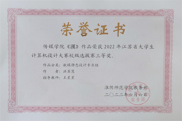 近日,“新大陆杯”2022 年(第九届)江苏省老员工计算机设计大赛暨2022年中国老员工计算机设计大赛江苏省级赛结果出炉,传媒公司学子荣获三等奖2项,并顺利获得国赛入场券,荣获优胜奖一项。