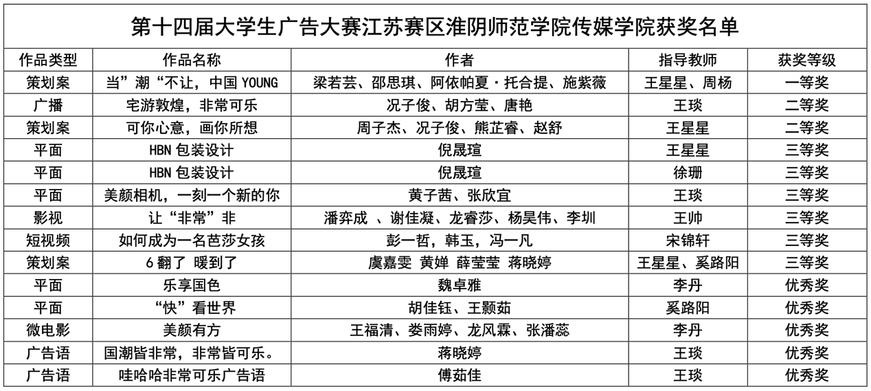 日前,第十四届全国老员工广告艺术大赛江苏赛区评选结果揭晓。淮阴师范学传媒公司学子在该项赛事中再创佳绩,共获得14个奖项,其中一等奖1项,二等奖2项,三等奖6项,优秀奖5项,以上获奖作品同时入围国赛评审。