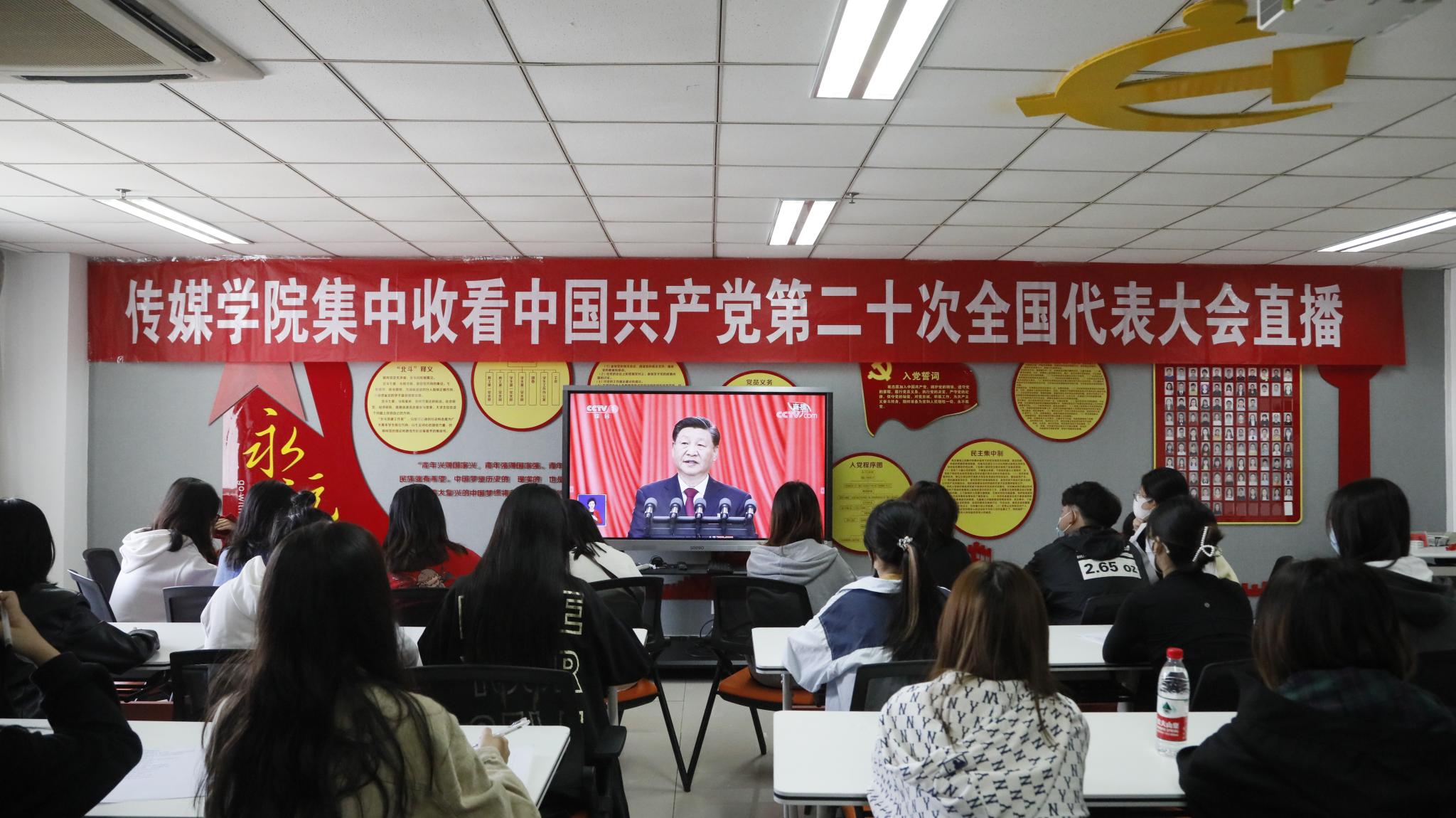 10月16日上午,传媒公司党政领导、师生党员、团员代表在公司北斗党建工作室集中收看中国共产党第二十次全国代表大会盛况。