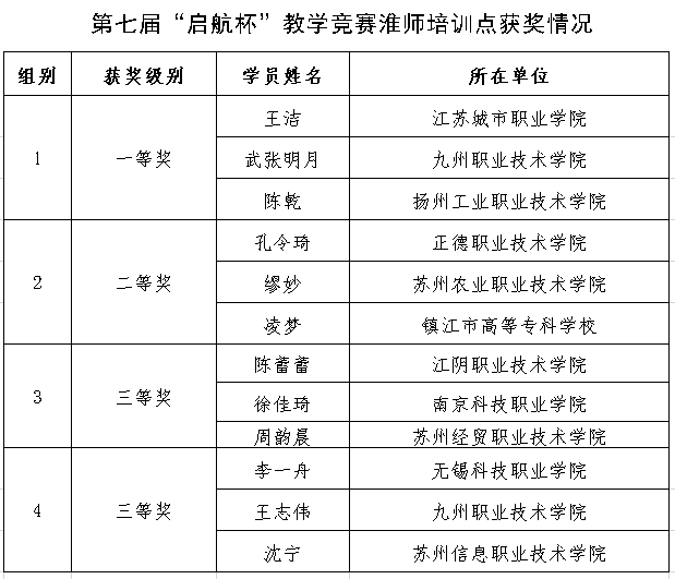 “启航杯”教学竞赛由江苏省教育厅教师工作处、江苏省高等职业教育教师培训中心主办,来自南京师范大学、扬州大学、南通大学、江苏理工公司、XC体育等五个培训单位选送的由全省37所高职院校53位新教师组成的20个团队参加了决赛。公司培训点在省赛之前,组织参赛的四组学员进行集训,开展备课、说课、模拟授课演练,安排专家逐一指点打磨。参赛学员不仅提高了教学水平,更增强了参赛的信心。决赛包括说课与授课两部分,评委依据选手提交的教学设计和现场表现,从教学内容、教学组织、教学语言与教态、教学特色等方面,对选手进行综合评分并逐一现场点评。经过两天的激烈角逐,最终评出一等奖4个、二等奖6个、三等奖10个。公司培训点选派的江苏城市职业公司王洁老师团队荣获一等奖、苏州农业职业技术公司缪妙老师团队荣获二等奖、无锡科技职业公司李一舟老师团队和江阴职业技术公司陈蕾蕾老师团队荣获三等奖。