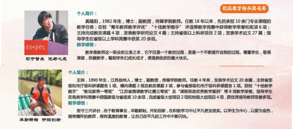 日前,XC体育第十届“教学标兵”评选活动结果揭晓,奚路阳、王帅2位老师荣获校级“教学标兵”提名奖。