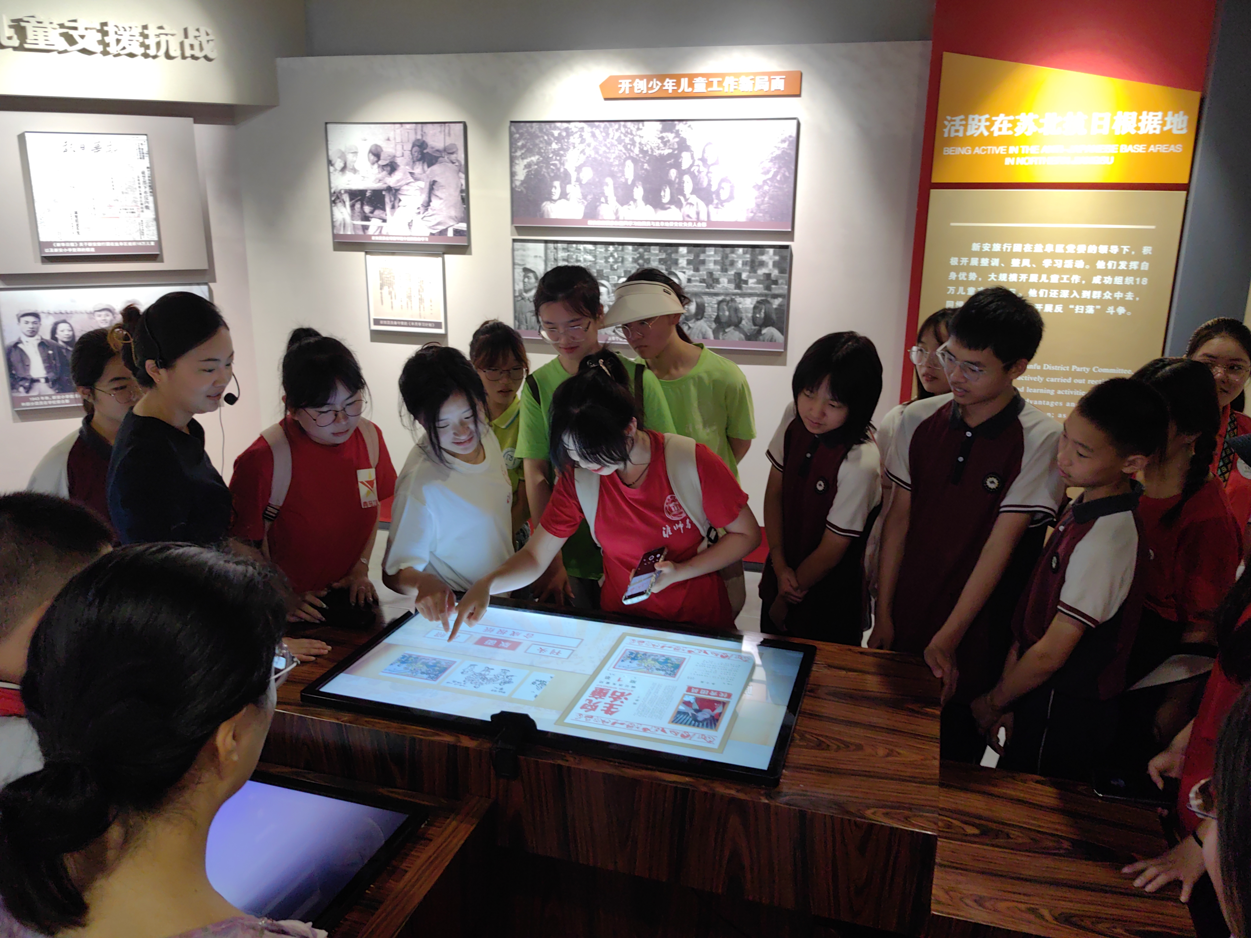 牢记嘱托,追寻红色足迹。同学们认真参观学习有关新安旅行团的历史图片、文字资料等,现场生动的幻影成像、模拟实景让同学们一起追忆了承载着血与光的光辉岁月,深刻感受新安旅行团的小老汉们以文艺为武器,宣传抗日救亡的爱国奋进的精神。虽然跨越近90载的时光,但爱国的少年心总是心心相通,同学们讨论交流、驻足思考中进一步领会“时代各有不同,青春一脉相承”。