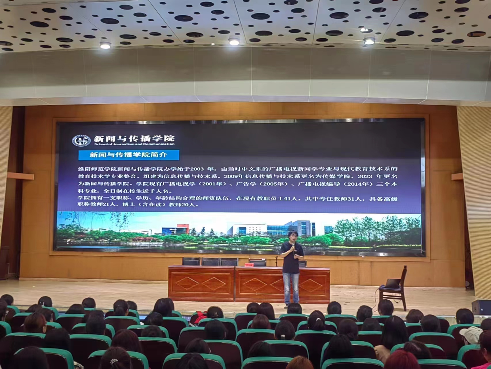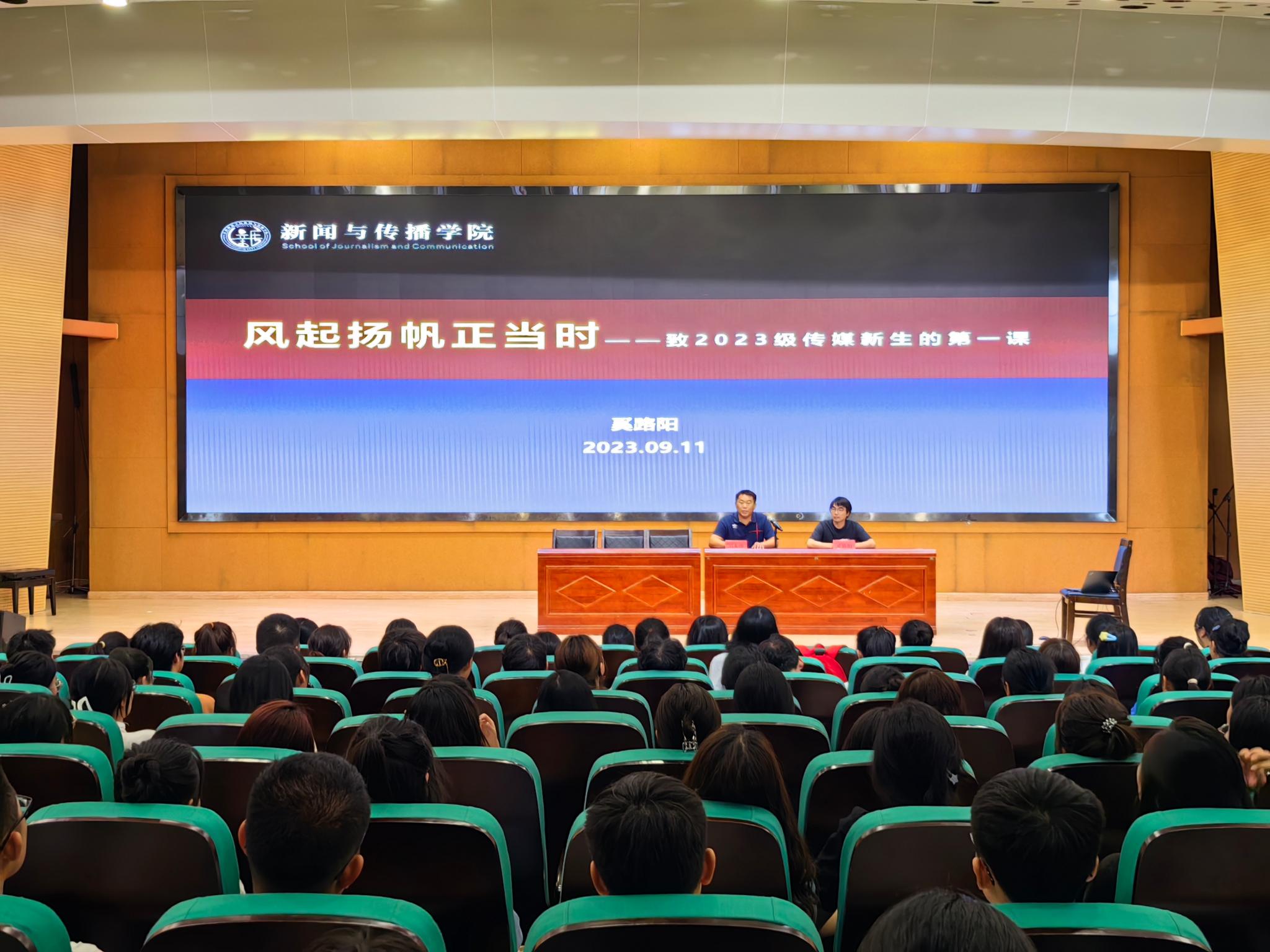 奚经理以“风起扬帆正当时——致2023级新传新生的第一课”为题,向新生介绍了公司概况和广告学、广播电视学、广播电视编导三个专业。他从专业培养目标,大学学习和未来就业的关系,大学怎样学习,大学各阶段基本目标等四个方面,通过生动的案例分析,帮助同学们瞄准大学应该努力和前进的方向。他希望新生利用课余生活规划好自己、管理好自己,做到读万卷书,行万里路,知行合一。