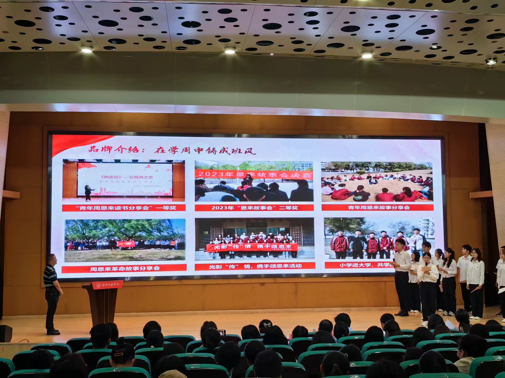 本次“周恩来班”公开评选汇报会由现场汇报和答辩两个环节组成。全校10个入围班级聚焦周恩来同志崇高精神风范凝练班级特色,以饱满热情的精神状态,多角度、全方位展现“周恩来班”创建成果。传媒2006班以反转课堂的独特形式,将打造品牌的专业知识融入周恩来班级创建的过程中,独创“翔宇之声”班级品牌,在传播中传唱翔宇之声。