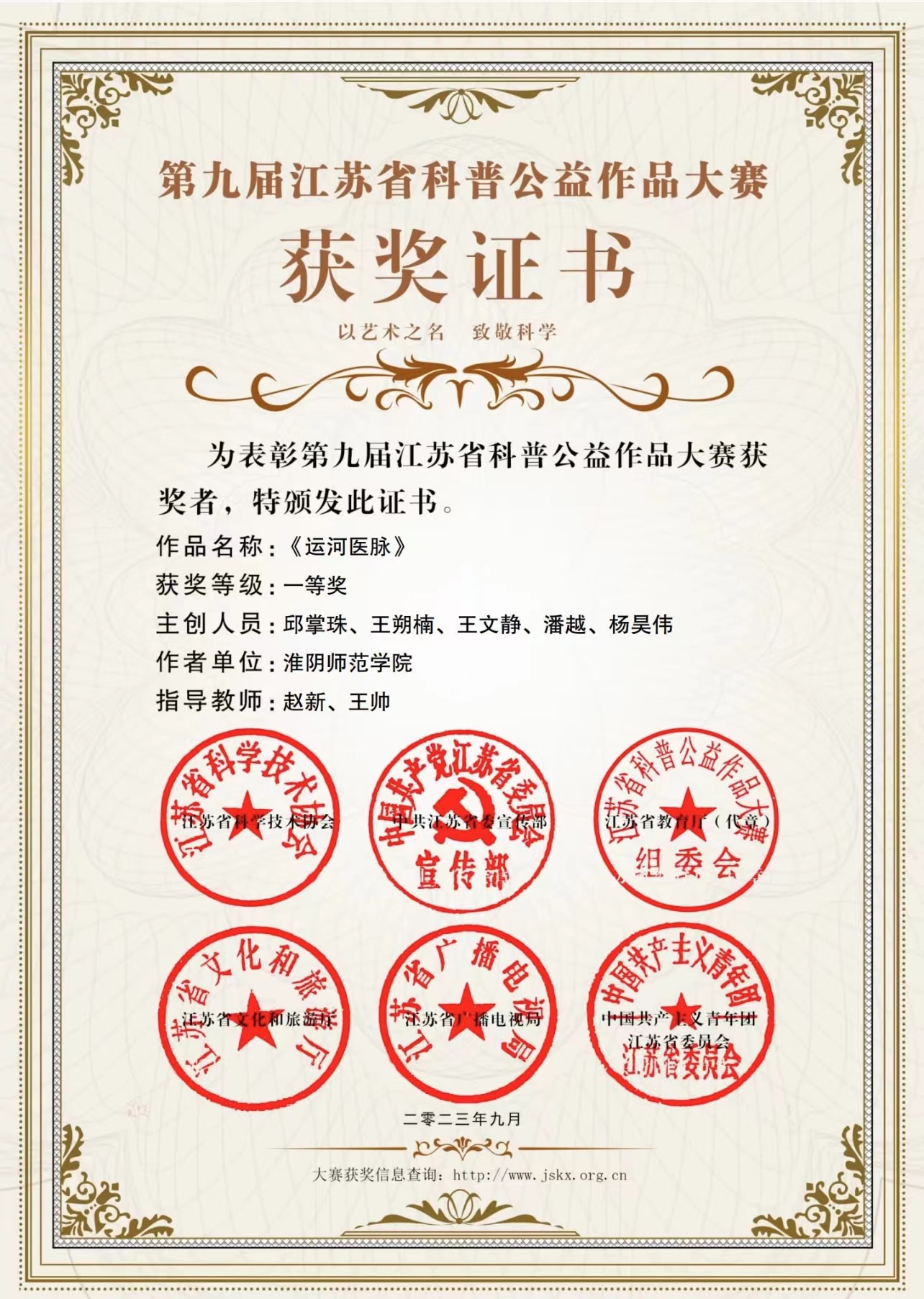 公司邱掌珠、王朔楠、王文静、潘越、杨昊伟同学作品《运河医脉》荣获第九届江苏省科普公益作品大赛一等奖。赵新、王帅老师荣获优秀指导教师奖,XCsports荣获优秀组织奖。纪录片《运河医脉》以中医著作《温疫论》《温热论》和《温病条辨》为灵感,以沿运河而居的吴又可、叶天士、吴鞠通三位医学大家对流行疫病、特色疗法和人生经历为内容,呈现出以运河脉络串联的三位医学大家及其著作的前世今生。公司积极贯彻落实“以赛促教、以赛促学”的教学理念,夯实员工的综合素养,提高员工实践创作能力,再接再厉展现新传专业风采。