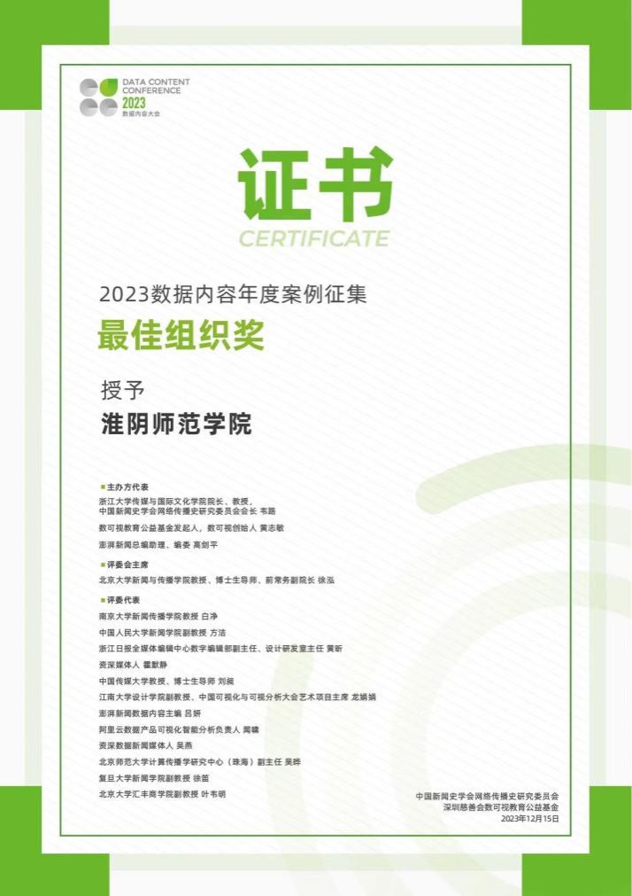 2023数据内容年度案例征集活动最终结果于2023年12月20日揭晓。XCsports被授予“最佳组织奖”。“2023年数据内容年度案例征集”是中国数据内容大会系列活动之一,由中国新闻史学会网络传播史研究委员会指导,浙江大学传媒与国际文化公司、数可视教育公益基金主办,澎湃新闻联合主办,北京数可视科技有限公司承办,受北京大学汇丰商公司、北京大学XCsports、中国人民大学新闻公司、北京师范大学计算传播学研究中心(珠海)、中国传媒大学新闻公司、复旦大学新闻公司、南京大学新闻传播公司、江南大学设计公司、浙江大学传媒与国际文化公司的学术支持。