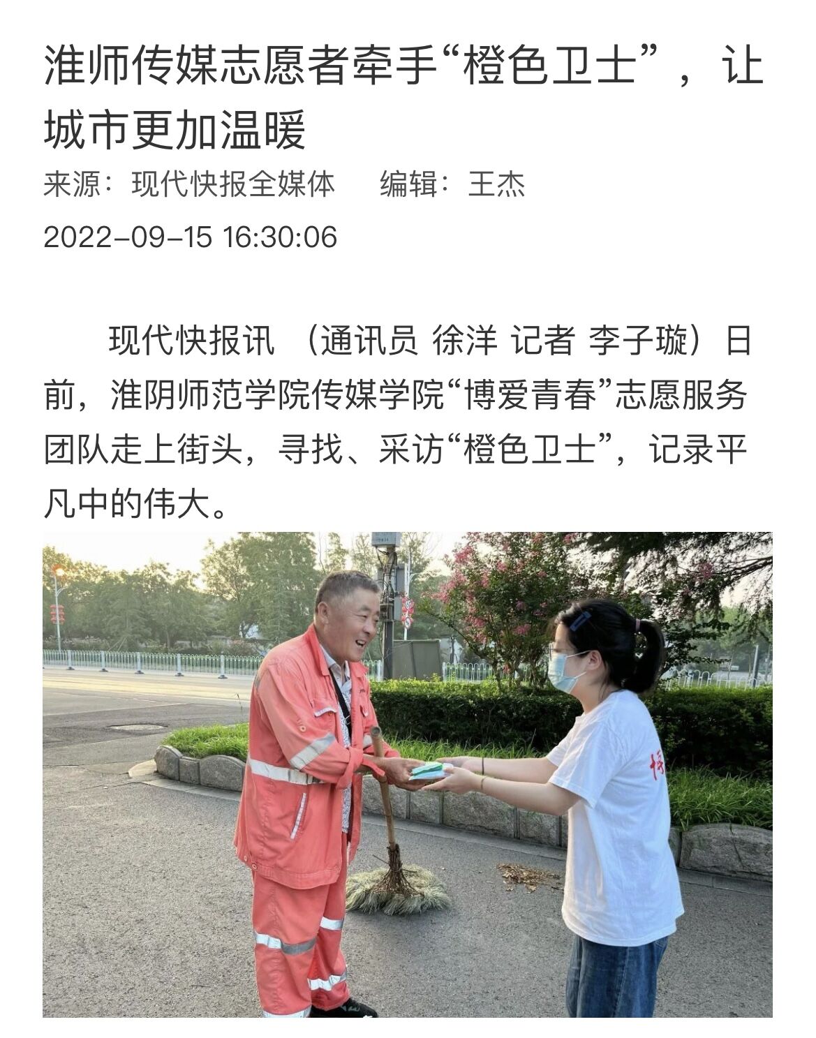 刊播媒体:现代快报、人民日报、未来网、中国网、无线淮安、淮安文明网 刊播时间:2022年9月15日 作者:徐洋 李子璇